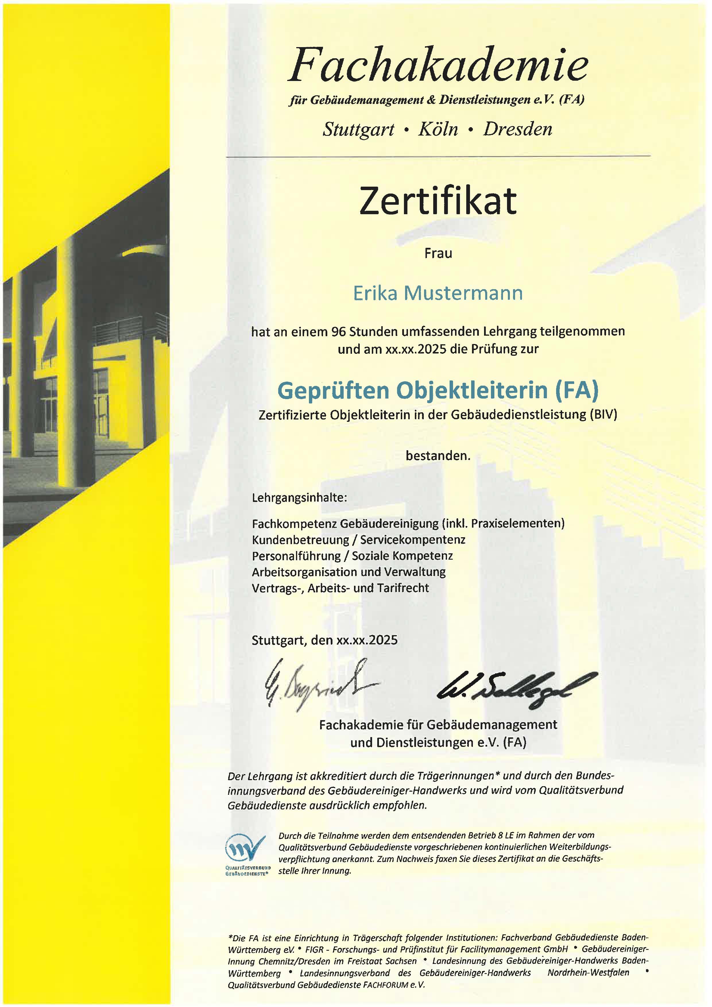 Alle FA-Lehrgänge und viele FA-Seminare sind anerkannte Weiterbildungen im Sinne des Qualitätsverbunds Gebäudedienste www.qv-gebaeudedienste.de. Die Vorlage der Teilnahmeurkunde (per E-Mail oder Fax an die zuständige Innung) dient dem Nachweis der kontinuierlichen Weiterbildung des Betriebs.